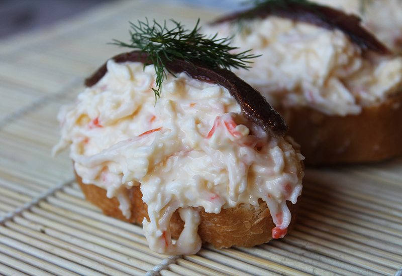 También puede presentarse sobre una rodaja de pan y adornado con una anchoa, gamba o trozo de salmón encima.